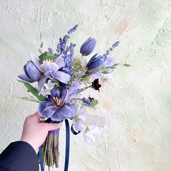 오묘한 컬러의 블루 염색 튤립 부케입니다. 유니크한 부케를 원하시는 신부님께 추천드립니다. 추천 계절 : 여름, 겨울