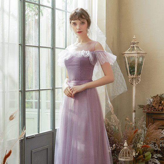 파스텔 바이올렛톤의 도트무늬가 돋보이는 튤 소재의 발목 기장감의 롱드레스입니다.