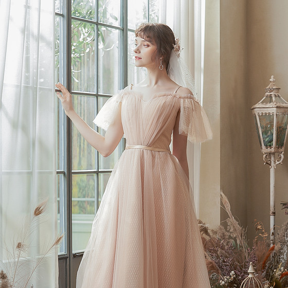 오프숄더라인으로 쇄골라인을 더욱 돋보이게해주며 소매의 2중 튤이 신경쓰일 수 있는