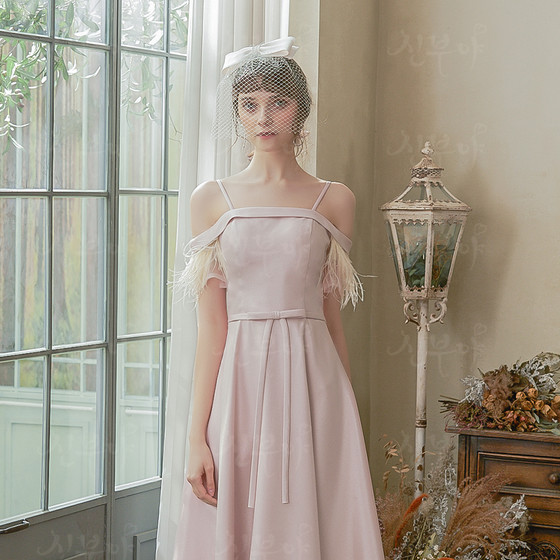오프숄더가 어깨라인을 돋보이게 해 주며 깃털 장식이 유니크함을 더해줍니다.